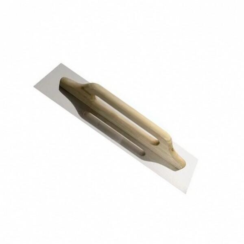 Прочное металлическое полотно для долговечности, деревянная рукоять для надежного хвата, большой размер для эффективной работы на значительных площадях, швейцарский тип конструкции для качественного выравнивания штукатурки и шпаклевки.