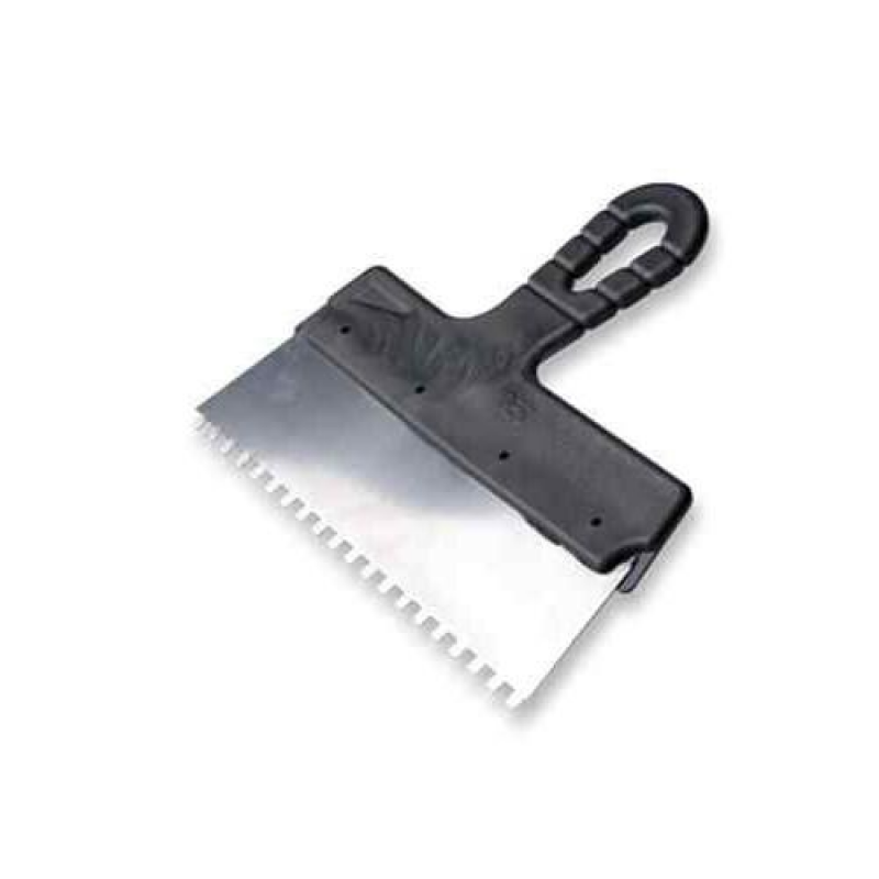 Прочное и коррозионностойкое лезвие из нержавеющей стали, удобная рукоятка для продолжительной работы, универсальное применение для различных смесей, идеальное нанесение клея за счет зубцов 10x10 мм.