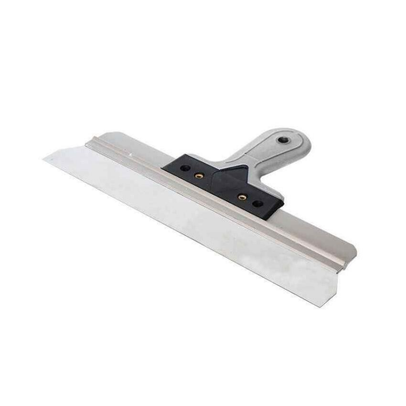 Высокая жесткость и упругость лезвия, прочная двухкомпонентная ручка, увеличенная ширина рабочей части (200 мм), алюминиевое ребро жесткости против искривления, изготовлен из нержавеющей стали.
