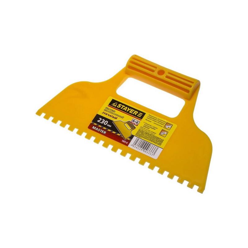 Пластиковый шпатель STAYER шириной 23 см с квадратным зубом 6x6 мм. Предназначен для нанесения и равномерного распределения клеящих составов, шпаклевки и других строительных смесей.