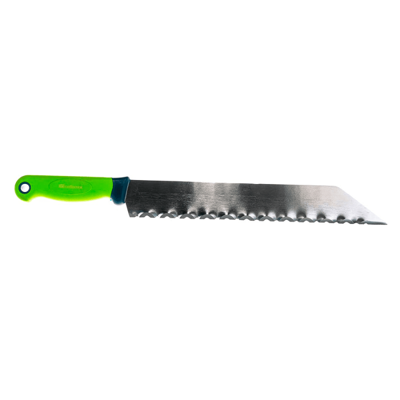 Острозаточенное лезвие легко режет длинные и толстые пласты утеплителя. Нержавеющая сталь устойчива к коррозии и позволяет работать в условиях повышенной влажности. Противоскользящая рукоятка повышает безопасность и комфорт при работе. Удобная упаковка-блистер обеспечивает сохранность инструмента.