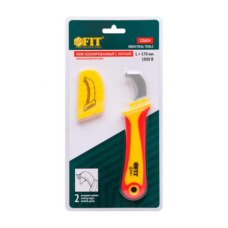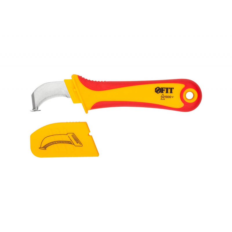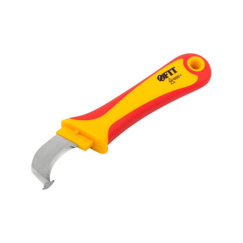Профессиональный изолированный нож FIT с защитной пяткой. Перовое лезвие длиной 37 мм из высококачественной стали идеально подходит для точных работ. Эргономичная рукоять из пластика и термопластичной резины обеспечивает надежный и комфортный хват. Общая длина инструмента — 170 мм, что делает его маневренным и удобным в использовании.