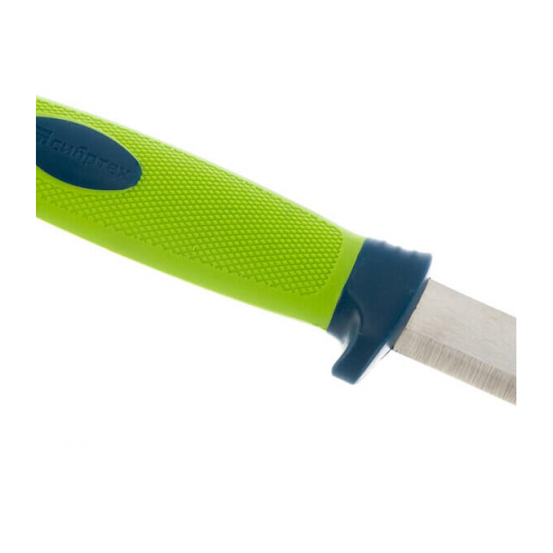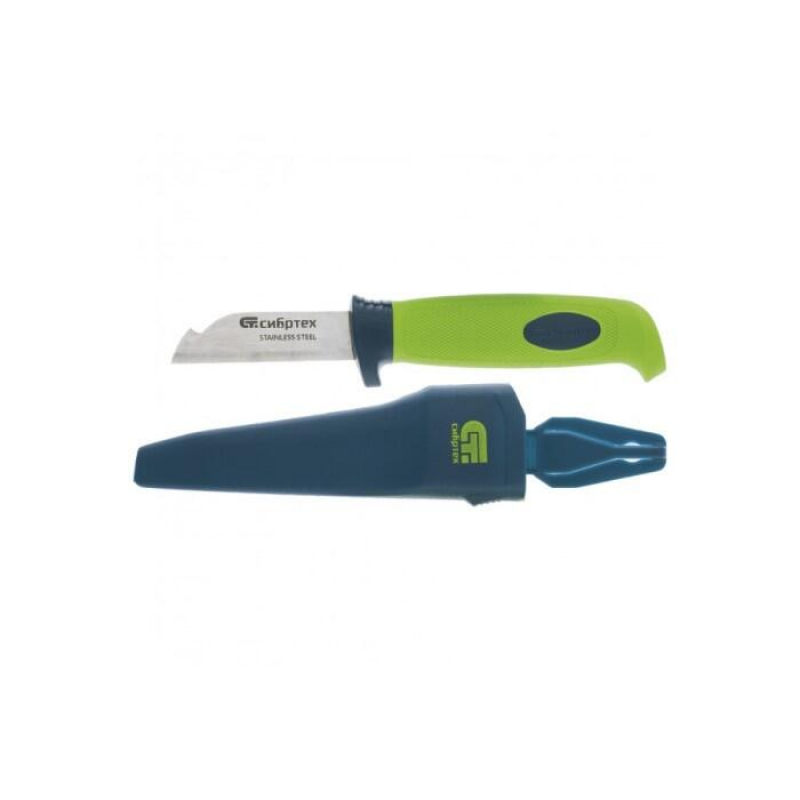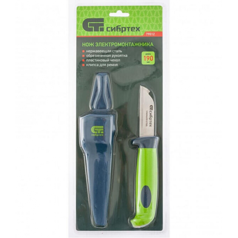 Нож монтажника СИБРТЕХ 79012 с фиксированным перовым лезвием 67 мм. Общая длина инструмента 190 мм. Лезвие из коррозионно-стойкой стали 4Cr14. Рукоятка изготовлена из пластика с резиновыми накладками для надежного хвата. В комплекте пластиковый чехол с клипсой для крепления на ремень.