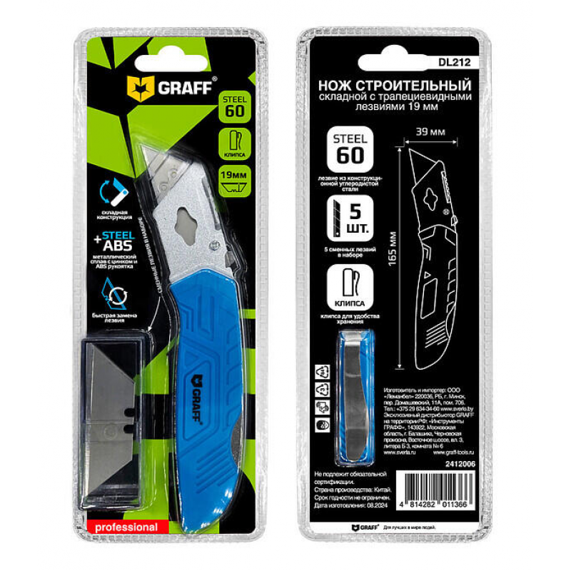 Складной нож Graff DL212 с уникальным трапециевидным лезвием. Идеально сбалансированная модель общей длиной 165 мм и шириной клинка 19 мм. Эргономичная рукоять из прочного пластика обеспечивает надежный хват. Компактный и легкий (вес всего 106 г), нож готов к использованию в любой ситуации.