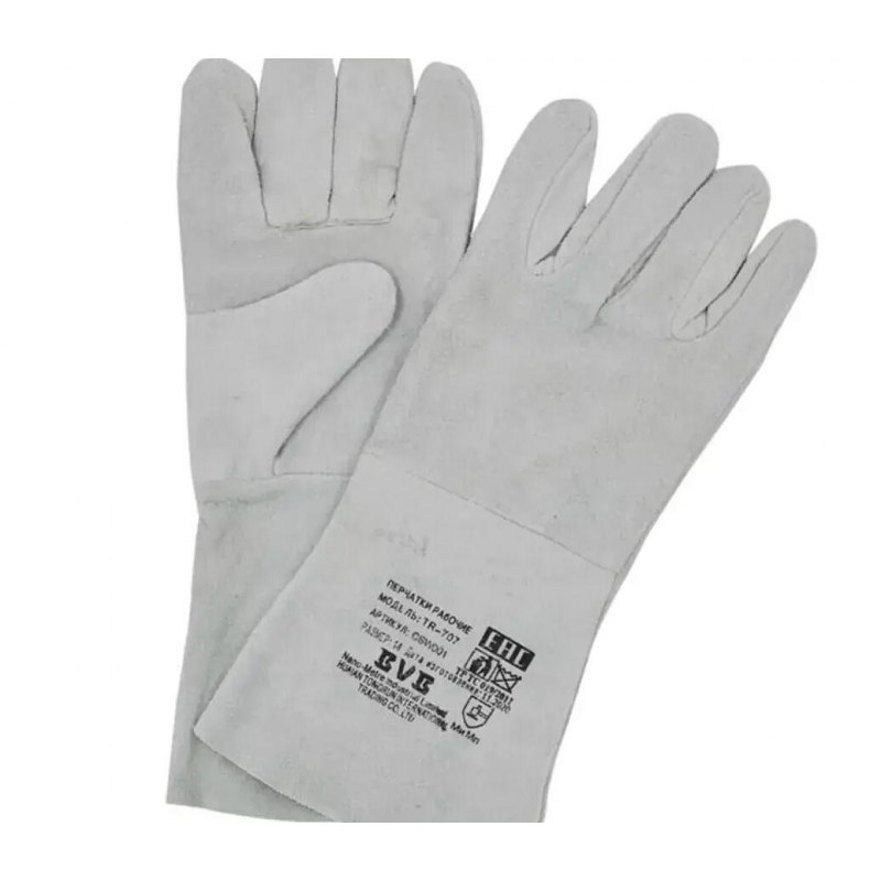 Серые спилковые краги BVB TR-707 размера XL. Изготовлены из прочного спилка, обеспечивающего надежную защиту рук. Продукция бренда BVB от производителя WUXI LTD.