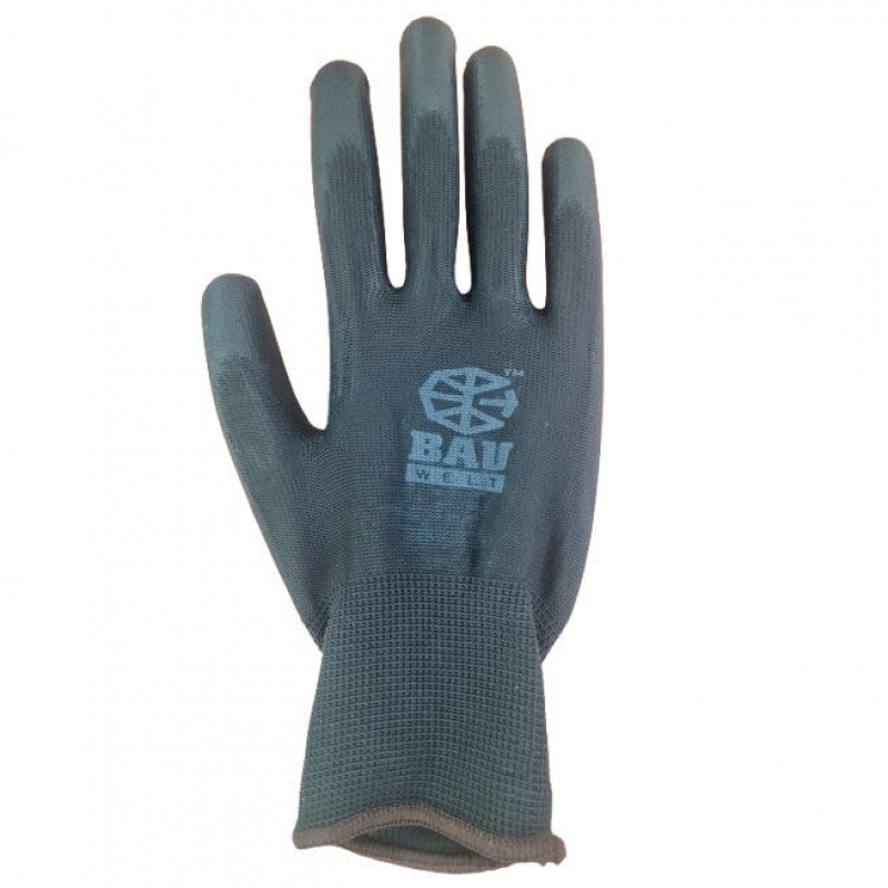 Прочные рабочие перчатки BAUWELT модели 24215. Основа из полиэстера с полиуретановым покрытием (ПУ облив) для надежного хвата и защиты. Размер L, класс вязки 13 обеспечивает высокую плотность и долговечность. Цвет: черный.