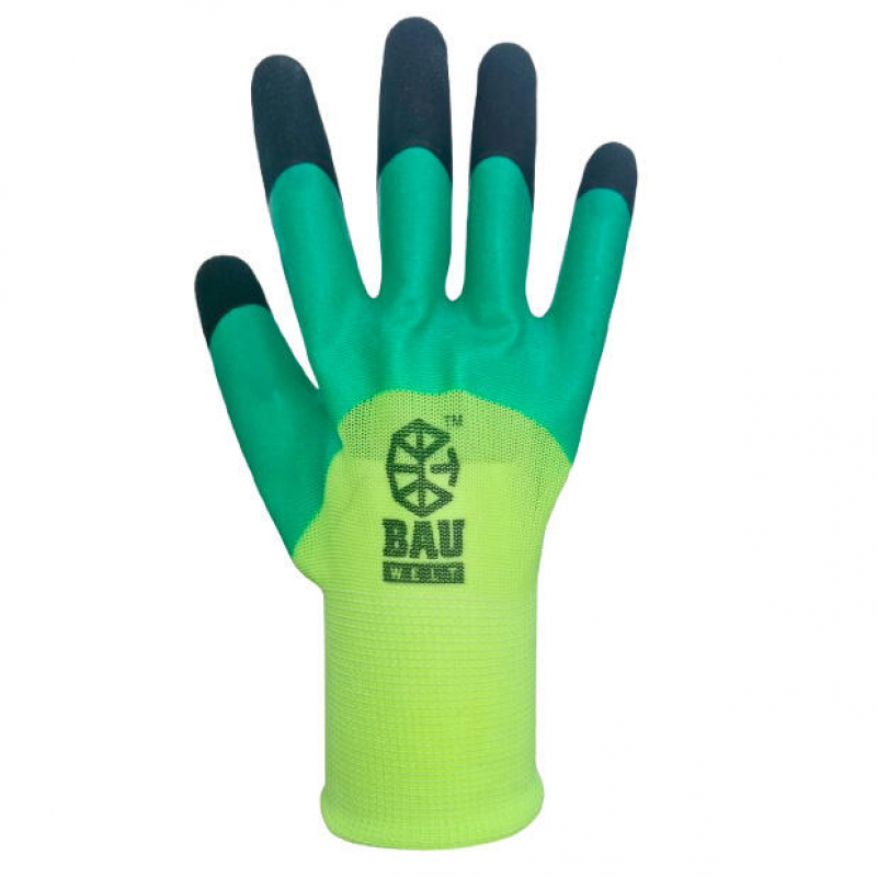 Прочные рабочие перчатки BAUWELT 24226 для тяжелых условий. Модель XL с полным латексным покрытием и усиленными накладками на пальцах (13 класс вязки) для максимальной защиты. Основа из полиэстера обеспечивает комфорт и долговечность.