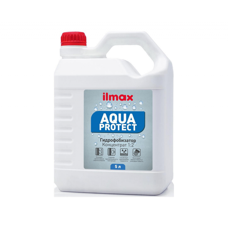 Гидрофобизатор ILMAX aqua protect концентрат на силан-силоксановой основе предназначен для защиты минеральных поверхностей: кирпича, бетона, штукатурок, натурального и искусственного камня, тротуарной плитки, черепицы и других. Образует прозрачное матовое покрытие, блокирующее проникновение влаги. Объем: 5 кг. Концентрат для наружных работ, разбавляется водой в пропорции 1:1 или 1:2.