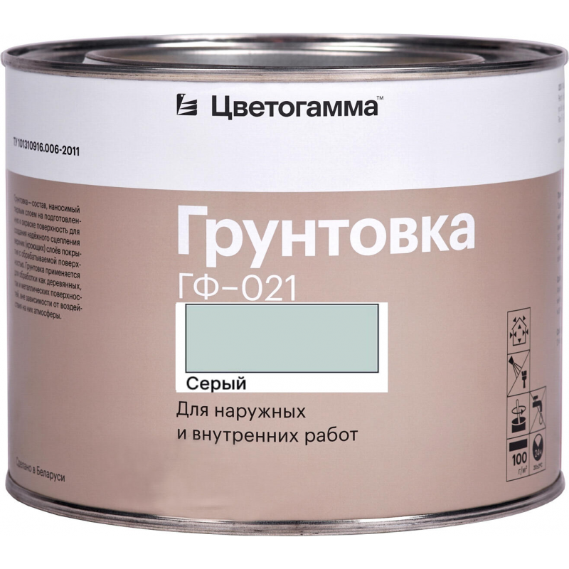 Грунтовка алкидная Цветогамма ГФ-021 серый 0,8 кг — универсальное антикоррозийное покрытие для металлических и деревянных поверхностей. Представляет собой суспензию пигментов и наполнителей в алкидном лаке. Предназначена для подготовки поверхностей под покраску эмалями и для временной защиты от ржавчины. Подходит для наружных и внутренних работ. Цвет: серый. Время высыхания: 24 часа. Расход: 0.1-0.15 кг/м².