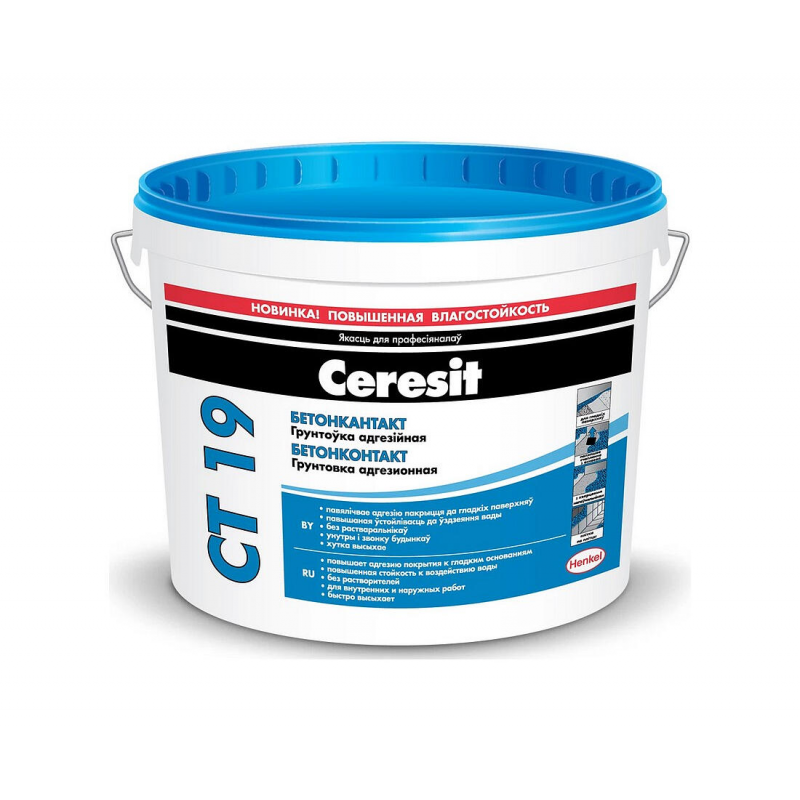 Адгезионная грунтовка CERESIT СТ 19 Бетонконтакт для обработки гладких бетонных и минеральных поверхностей перед оштукатуриванием и укладкой плитки. Готовая к применению акриловая дисперсия красного цвета, обеспечивает надежное сцепление отделочных материалов с основанием.