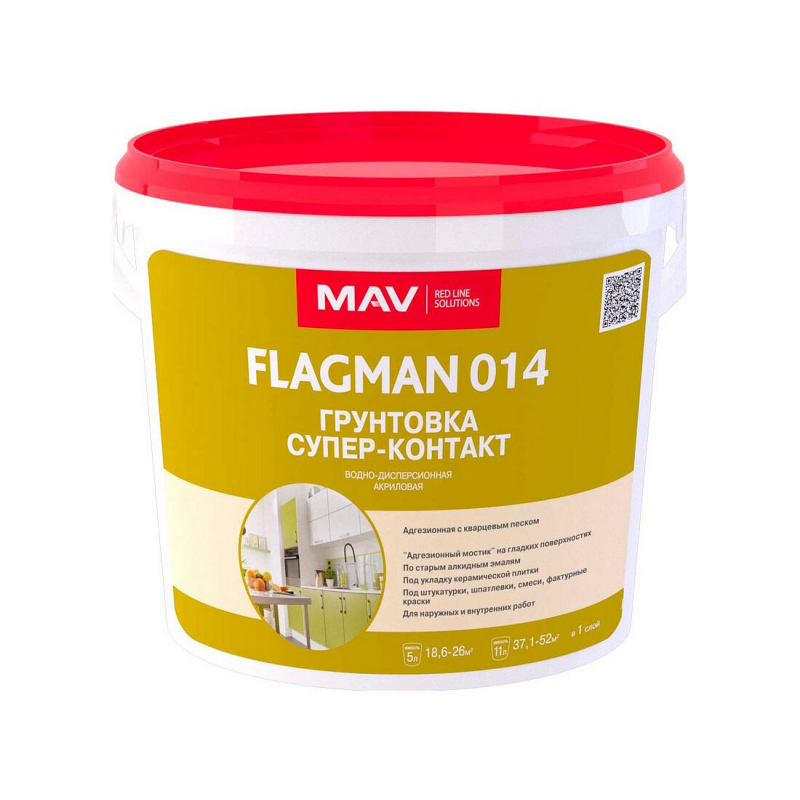 Акриловая грунтовка MAV Flagman 14 супер-контакт для создания шероховатого адгезионного слоя на плотных и гладких минеральных поверхностях (бетон, штукатурка, кирпич, гипсокартон, керамическая плитка) перед нанесением штукатурок, шпатлевок, красок и клеящих составов. Применяется для внутренних и наружных работ, в том числе в системах утепления. Готова к применению, цвет белый.