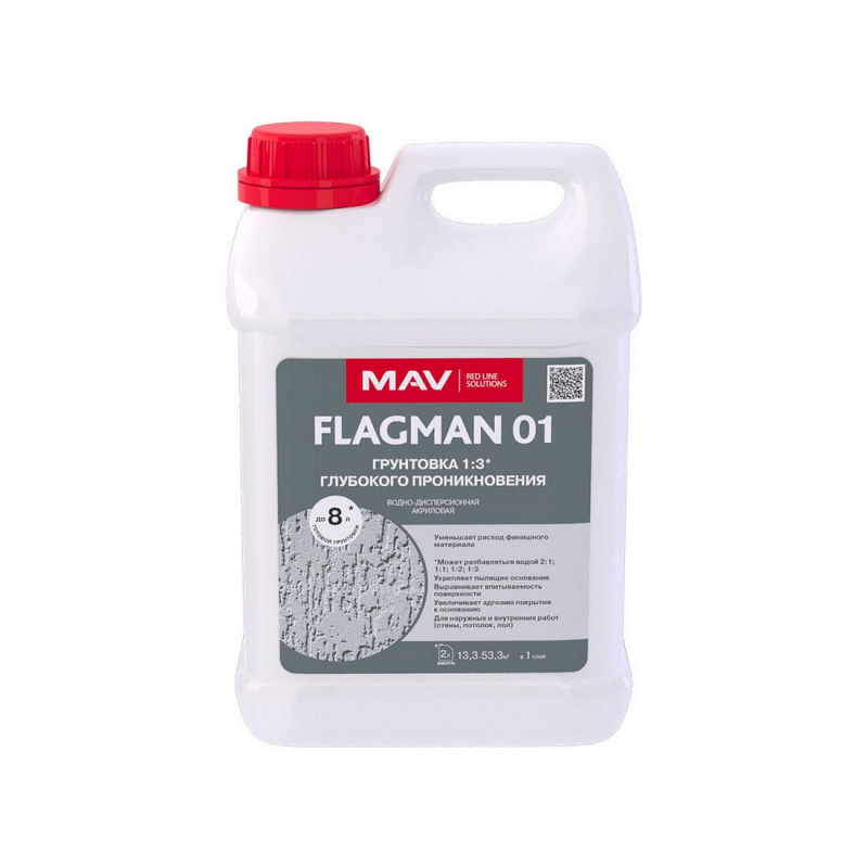 Грунтовка акриловая МАВ ВД-АК-01 глубокого проникновения для подготовки минеральных поверхностей (бетон, кирпич, штукатурка, гипсокартон) перед финишной отделкой: нанесением красок FLAGMAN, шпатлеванием, оштукатуриванием, укладкой плитки, оклейкой обоями или заливкой самонивелирующихся полов. Подходит для систем утепления фасадов. Бесцветная, готова к применению, обладает противогрибковыми свойствами.