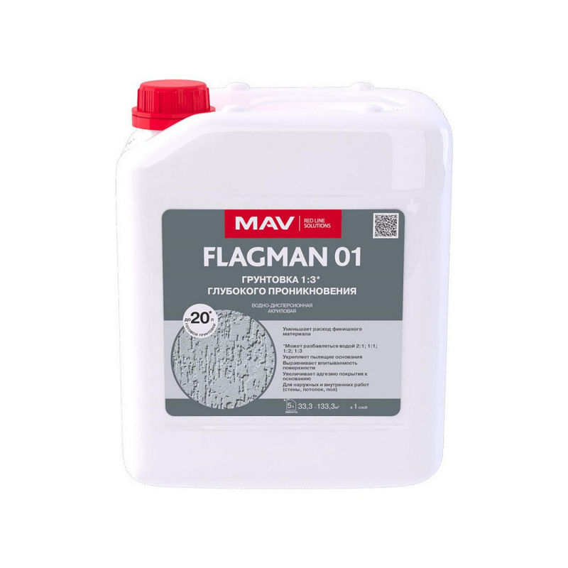 Акриловая грунтовка глубокого проникновения МАВ ВД-АК-01 для минеральных поверхностей: бетона, кирпича, штукатурки, гипсокартона. Подготовит основание под шпатлевку, покраску, укладку плитки, оклейку обоями или заливку наливных полов. Бесцветная, готова к применению, объем 5 литров.