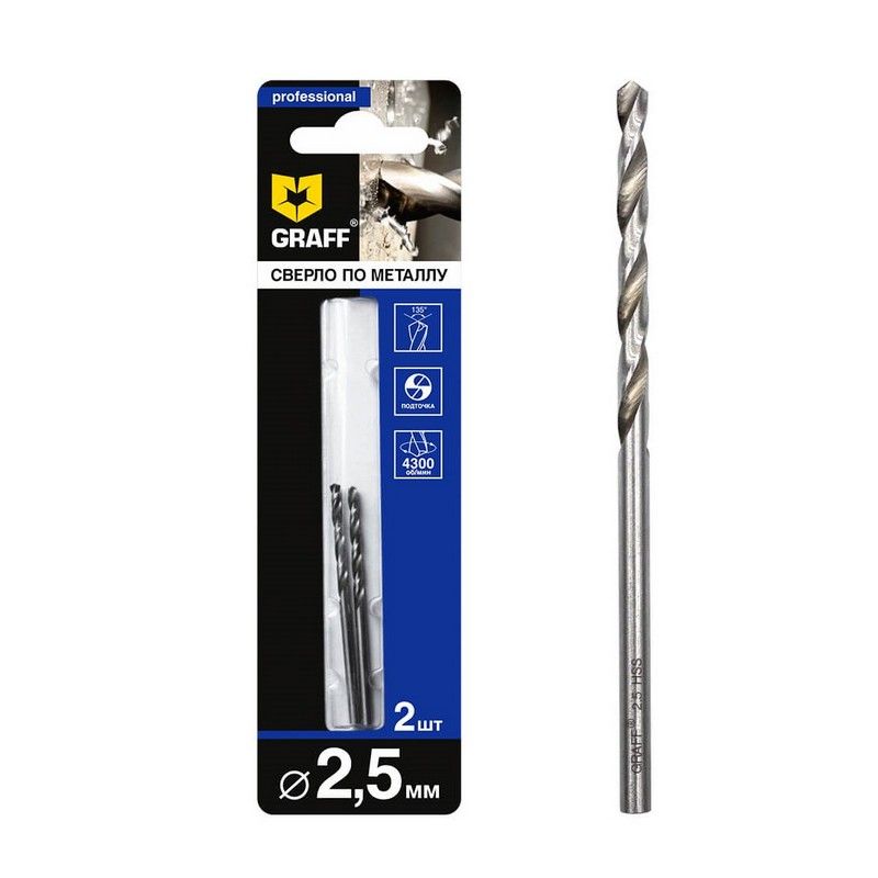 Сверло по металлу 2,5 мм GRAFF - средняя серия. Отличное спиральное сверло по металлу из быстрорежущей стали HSS 4341, изготовленное методом вальцевания (продольно-винтовой прокат) c вышлифованной кромкой, класс точности В1. Угол при вершине 135 градусов и крестовая подточка обеспечивают отличное сверление металла без предварительного засверливания. Сверло изготовлено по ГОСТ 10902-77 (DIN 338) и предназначено для сверления отверстий в легированных и нелегированных сталях, ковких и серых чугунах.Рекомендация по числу оборотов для сверла диаметром 2,5 мм - 4300 об/мин. Обращаем ваше внимание, что скорость сверления указана для нелегированной стали. При обработке других видов металла число оборотов будет отличаться.