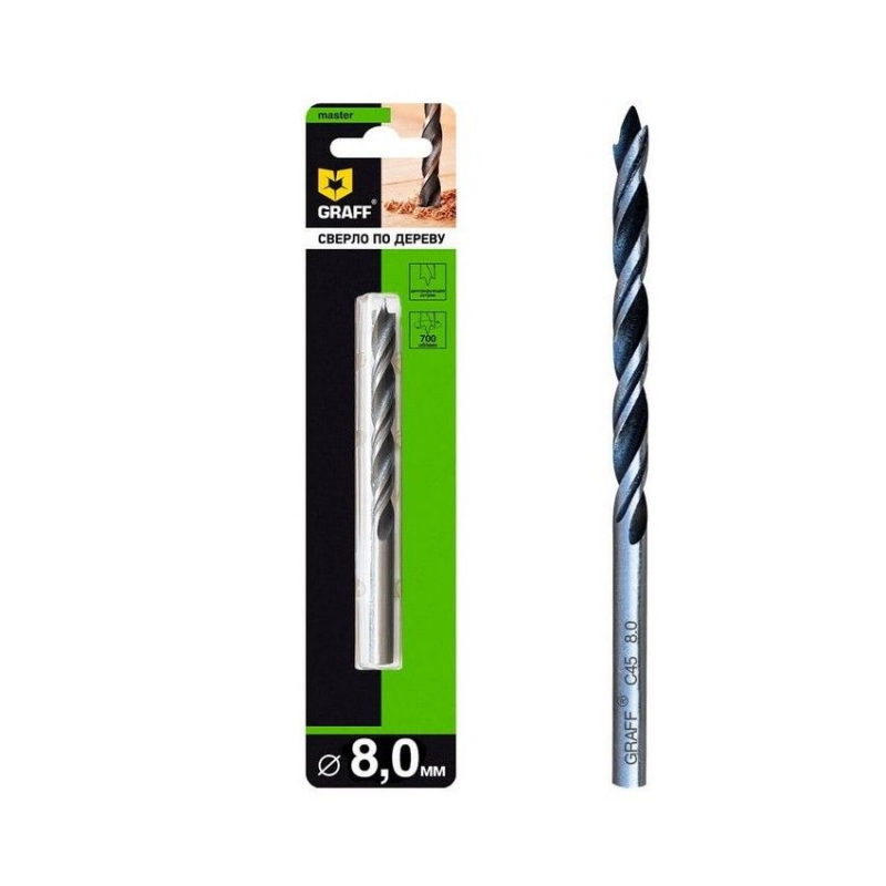 Сверло по дереву спиральное 8x117 мм GRAFF выполнено в стандартных размерах и используется для обработки мягкой древесины, столярных плит и ДСП без покрытия. Быстрое сверление даже при установке в аккумуляторных дрелях. Центрирующее острие и 2 наружные режущие кромки.
