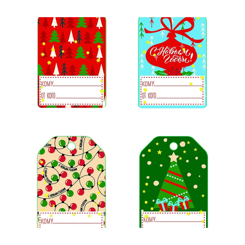 Яркий праздничный дизайн; Удобный размер 10×6 см; Комплект из 4 уникальных бирок; Качественный картон; Универсальное применение для подарков