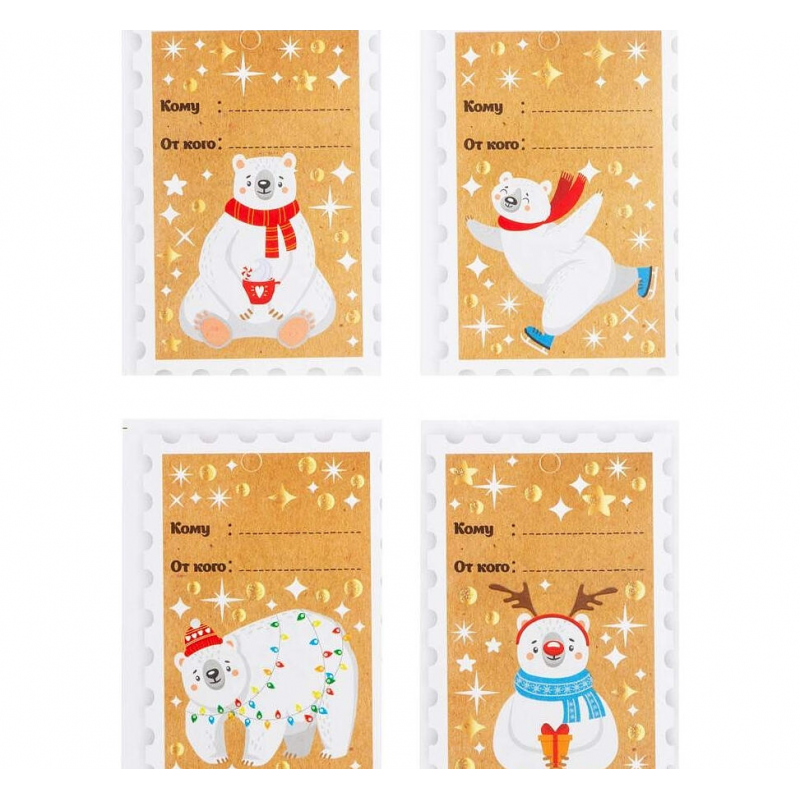4 открытки в наборе; милый дизайн с белым мишкой; компактный размер; качественная печать; подходят для различных поводов; удобны для вложения в подарки