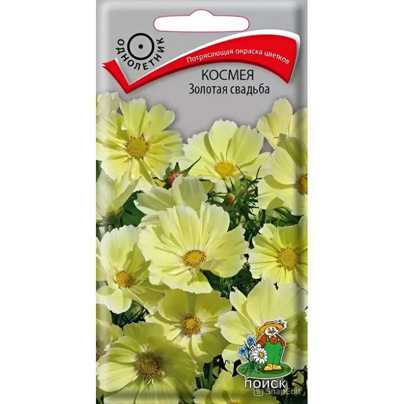 Семена Космея Золотая свадьба. Создание новой, уникальной окраски стало настоящим прорывом в селекции космеи. Декоративное растение высотой 50-60 см. Соцветия-корзинки диаметром 7-10 см. Окраска – золотисто-лимонная. Цветение раннее. Великолепно выглядят на клумбах, в бордюрах, особенно большими массивами, а также возможно использование в качестве контейнерной культуры. Прекрасный материал для срезки!