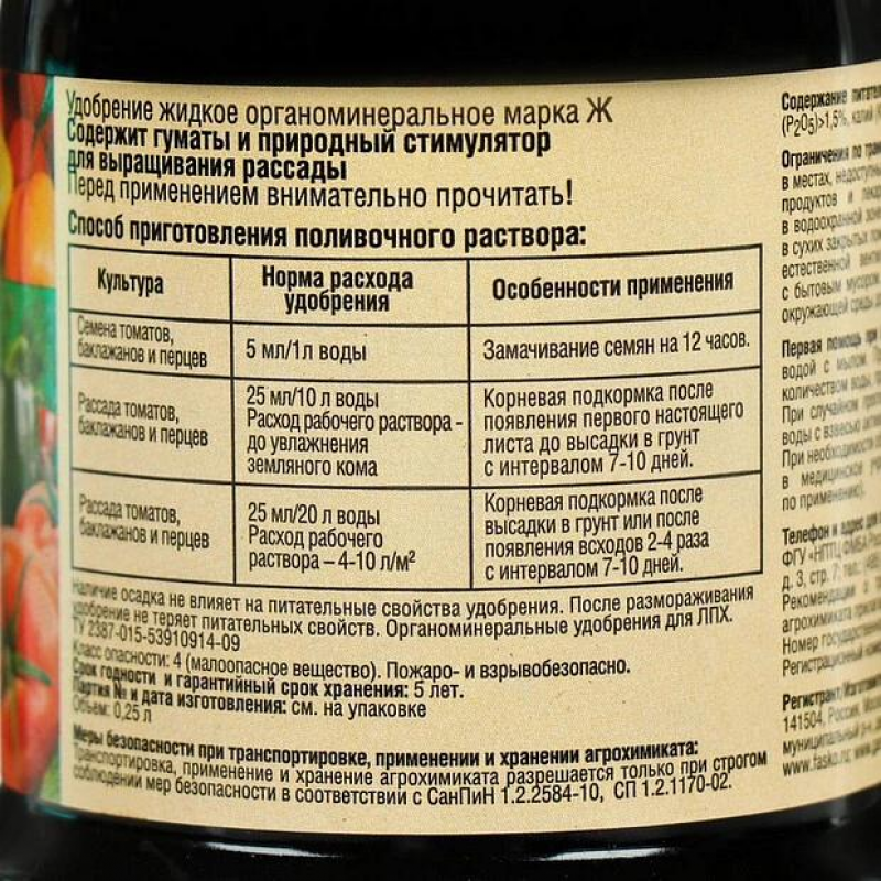 Жидкое органоминеральное удобрение с гуматами и природным стимулятором специально разработанное для применения при выращивании рассады томатов, баклажанов и перцев. Преимущества: ускоряет прорастание семян; обеспечивает гармоничный рост здоровой и крепкой рассады; повышает стрессоустойчивость растений после пикировки и пересадки; жидкая форма предотвращает обжигание неокрепших корней; органическая составляющая активно стимулирует рост и развитие корней, а также способствует защите молодого организма от болезней. Применение. Семена томатов, баклажанов и перцев: расход раствора 30 мл/0,5 л воды; замачивание семян на 24 часа. Рассада томатов, баклажанов и перцев: расход раствора 100 мл/1 растение; корневые подкормки после появления первого настоящего листа 1 раз в 7-10 дней. Рассада томатов, баклажанов и перцев: расход раствора 10 мл/2 л воды; некорневые подкормки после появления третьего настоящего листа 1 раз в 7-10 дней. Рекомендации. Удобрение рекомендуется использовать для бережной подкормки молодой рассады с момента появления первого листка до пересадки в открытый грунт.