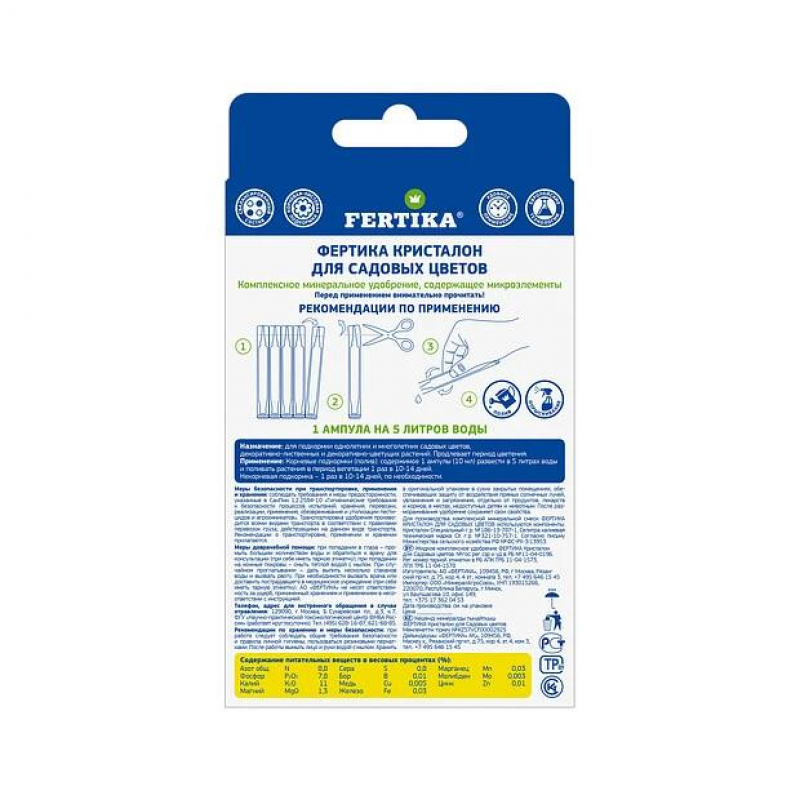 Для подкормки однолетних и многолетних садовых цветов, декоративно-лиственных и декоративно-цветущих растений, декоративных кустарников. Стимулирует развитие корневой системы растений. Повышает интенсивность окраски цветов и листьев декоративных культур, увеличивает продолжительность цветения. Корневые подкормки (полив):Содержимое 1 ампулы (10 мл) развести в 5 литрах воды и поливать растения в период вегитации 1 раз в 10-14 дней. Некорневая подкормка:1 раз в 10‑14 дней, по необходимости.
