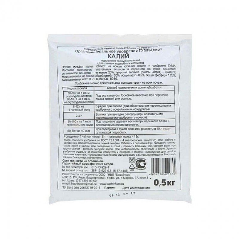 Органоминеральное калийное удобрение с микроэлементами для всех культур и видов почв. Порошково-гранулированное удобрение Гуми-Оми с повышенным содержанием калия обеспечивает растения калием, необходимыми макро- и микроэлементами. Гуми-Оми повышает урожайность, плодородие, улучшает структуру почвы и качество продукции. Эликсир плодородия Гуми улучшает структуру почвы, способствует продолжительному цветению и защищает растение от всевозможных стрессов при пересадке, погодных аномалиях, поражении вредителями и болезнями. Подходит для всех культур. В составе препарата высокоэффективные и быстродействующие природные гуматы с фульвовыми кислотами, которые обезвреживают ядохимикаты и улучшают экологическую чистоту ваших урожаев. Не содержит хлор.