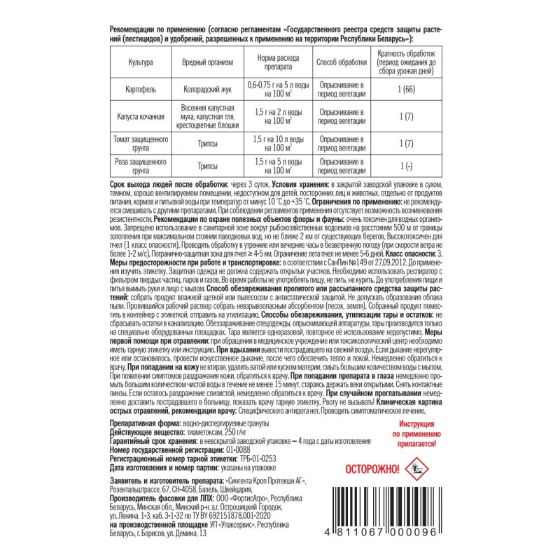 Инсектицид кишечно-контактного действия для контроля комплекса сосущих и листогрызущих вредителейСохранение листового аппарата, улучшение качества продукцииНизкая норма расхода, снижение числа обработокЭффективность независимо от внешних условий (сохраняет активность при высоких температурах, низкой влажности, устойчив к инсоляции, дождеустойчив)Длительный защитный эффектШирокий спектр активностиТрансламинарное действие при опрыскивании растенийСистемное действие при внесении в почвуБыстрое ингибирование питания насекомыхЭффективность против скрытноживущих и питающихся на нижней стороне листа насекомыхАКТАРА, ВДГ — инсектицид кишечно-контактного действия, предназначен для защиты: картофеля — от проволочника и наземных вредителей; капусты — от капустной мухи; гороха — от тли, зерновки; овощных и цветочных культур закрытого и открытого грунта — от тли, белокрылки, трипсов, щитовок и ложнощитовок; винограда и яблони — от медяниц, цикадок, цветоеда. Инсектицид применяют как для опрыскивания растений в период вегетации, так и для внесения в почву. При внесении в почву обладает выраженной системной активностью. Проникнув в организм насекомого, препарат воздействует на никотин-ацетилхолин-рецепторы в нервной системе, вызывая прекращение питания через 15–60 минут, в зависимости от типа вредителя. Применяется двумя способами: опрыскиванием и внесением под корень с поливной водой. При почвенном применении за счет системного действия инсектицид одновременно защищает от почвенных и наземных вредителей: сосущих, скрытноживущих и листогрызущих. Эффективно подавляет жуков (имаго и личинок), тлю, листоблошек, белокрылок, цикадок, клопов, двукрылых минеров, но слабоэффективен против чешуекрылых вредителей. Период защитного действия — 14–21 день при опрыскивании культуры, 40–60 дней при почвенном внесении.