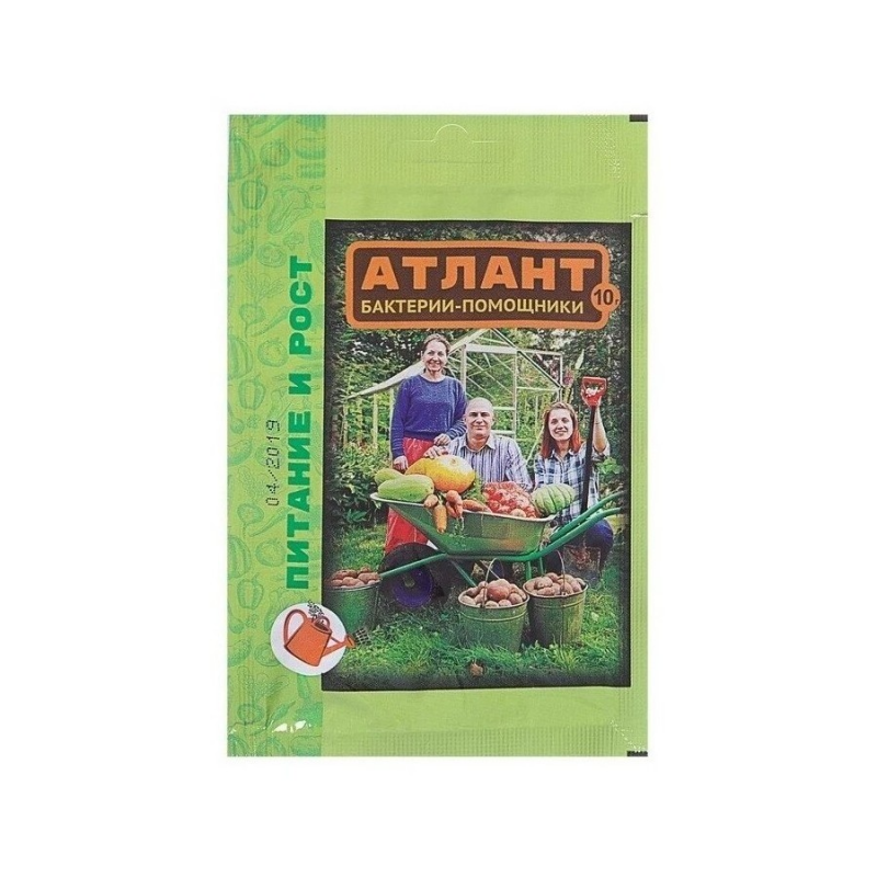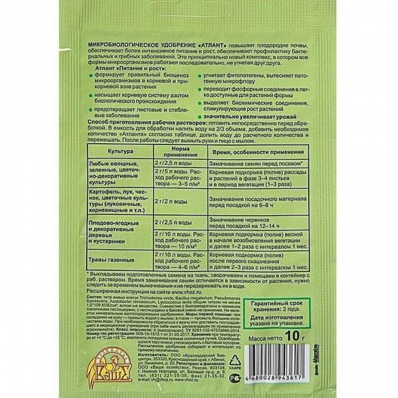 Повышает плодородие почвы, обеспечивает более интенсивное питание и рост, обеспечивает профилактику бактериальных и грибных заболеваний. Это принципиально новый комплекс, в котором все формы микроорганизмов работают последовательно, не угнетая друг друга. формирует правильный биоценоз микроорганизмов в корневой и прикорневой зоне растениянасыщает корневую систему азотом биологического происхожденияпредотвращает листовые и стеблевые заболеванияугнетает фитопатогены, вытесняет патогенную микрофлорупереводит фосфорные соединения в легко доступные для растений формывыделяет биохимические соединения, стимулирующие рост растенийзначительно увеличивает урожайСостав: титр живых клеток Trichoderma viride, Bacillus megaterium, Pseudomonas fluorescens, Azotobacter chroococum, Lactococcus lactis общим титром не менее 1,0*109 КОЕ/см², вспомогательные вещества. Способ приготовления рабочих растворов: препарат готовить непосредственно перед обработкой. В емкость для обработки налить воду на 2/3 объема, добавить необходимое количество «Атланта» согласно таблице, долить воду до расчетного количества и перемешать. После работы следует вымыть руки и лицо с мылом. Культура Норма применения Время, особенности применения Любые овощные, зеленные, цветочно-декоративные культуры 2 г / 2,5 л воды Замачивание семян перед посевом* 2 г / 5 л воды. Расход рабочего раствора — 3–5 л/м² Корневая подкормка (полив) рассады и растений в фазе 3–4 листьев и в период вегетации (1–3 раза) Картофель, лук, чеснок, цветочные культуры (луковичные, корневищные и т. п. ) 2 г / 2 л воды Замачивание посадочного материала перед посадкой на 6–8 ч Плодово-ягодные и декоративные деревья и кустарники 2 г / 2,5 л воды Замачивание черенков перед посадкой на 12–14 ч 2 г / 10 л воды. Расход рабочего раствора — 10 л/м² Корневая подкормка (полив) весной в начале возобновления вегетации и далее 1–2 раза с интервалом 1 мес. Травы газонные 2 г / 10 л воды. Расход рабочего раствора — 4–6 л/м² Корневая подкормка (полив) после первого скашивания и далее 2–3 раза с интервалом 1–1,5 мес. Хранение в сухих, чистых, вентилируемых помещениях при температуре от +4 °С до +25 °С, исключить попадание прямых солнечных лучей. Освободившуюся тару можно утилизировать с бытовым мусором в отведенных местах. Рассыпанное удобрение собирают и используют по прямому назначению. Срок годности: 4 года с даты изготовления.
