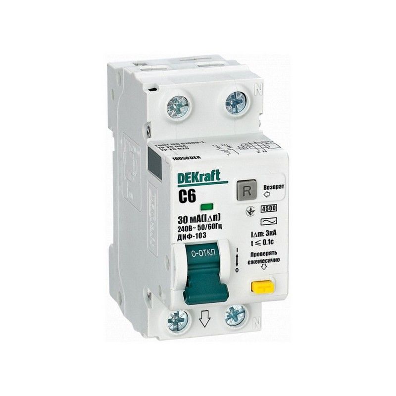 Дифавтомат DEKraft ДИФ-103 1П+Н 6А/30мА – компактное и эффективное устройство защиты, предназначенное для предотвращения коротких замыканий и утечек тока в однофазных электрических сетях. Этот дифференциальный автоматический выключатель с одним полюсом и нейтралью (1P+N) обладает номинальным током 6 А и током утечки 30 мА, что делает его подходящим для использования в сетях с низкой нагрузкой, например, для защиты бытовой электроники или осветительных систем.