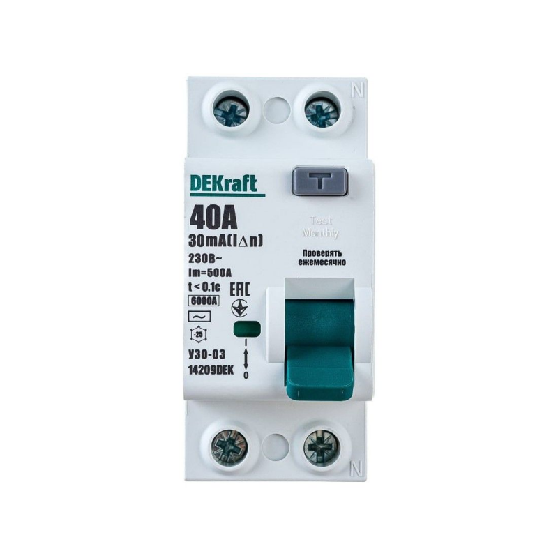 Устройство защитного отключения (УЗО) DEKraft 2П 40А/30мА – надежное устройство для защиты электрических цепей от утечки тока, предотвращая риск поражения током и возгорания. Оно рассчитано на номинальный ток 40 А и ток утечки 30 мА, что делает его подходящим для защиты высокомощных бытовых и коммерческих приборов.