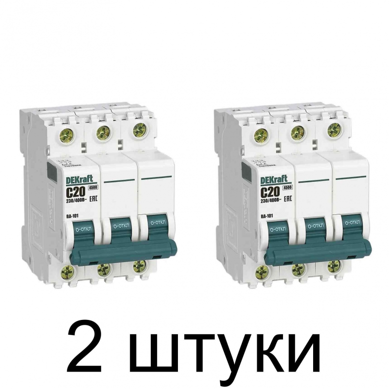 Выключатель автоматический DEKraft 3П 20А. Трехполюсный автоматический выключатель серии ВА-101 от DEKraft, предназначен для защиты трехфазных цепей от перегрузок и коротких замыканий, с номинальным током 20А. Обладает характеристикой срабатывания C, что позволяет использовать его в цепях с пусковыми токами. Отключающая способность составляет 4,5 кА, что обеспечивает надежную защиту. Устанавливается на DIN-рейку, занимая 3 модуля. Степень защиты IP20 подходит для использования в сухих помещениях. Вес изделия — 0,243 кг. Изготовлено компанией Delixi Electric Ltd в Китае.