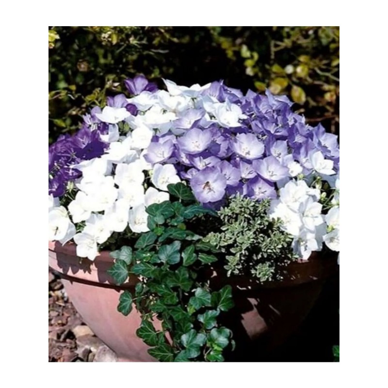Куст компактный, высотой 15-25 см. Цветки чашевидные, крупные, диаметром 3-5 см, белой и голубой окрасок.