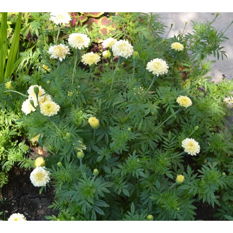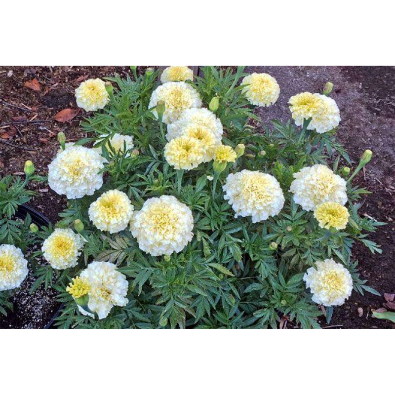 Низкорослые компактные бархатцы кремово-белой окраски. Растения ветвистые, хорошо облиственные, высотой до 40 см.