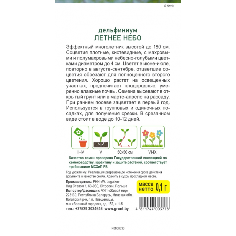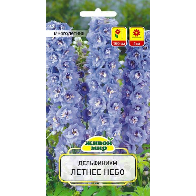 Высота до 180 см Эффектный многолетник высотой до 180 см. Соцветия плотные, кистевидные, с махровыми и полумахровыми небесно-голубыми цветками диаметром до 4 см. Цветет в июне-июле, повторно в августе-сентябре, отцветшие соцветия обрезают для полноценного второго цветения. Хорошо растет на освещенных участках, предпочитает плодородные, умеренно влажные почвы. Семена высевают в открытый грунт или в марте-апреле на рассаду. При раннем посеве зацветает в первый год. Используется в групповых и одиночных посадках, для получения срезки. В срезанном виде стоит в воде до 10-12 дней.