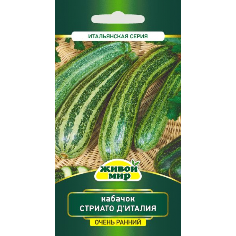 Раннеспелый Раннеспелый сорт цукини, от всходов до первого сбора 40-45 дней. Растение кустовое. Плоды цилиндрические, светло-зелёные с длинными тёмно-зелёными полосами, длиной 21-28 см, с кремовой мякотью, очень вкусные, пригодны для всех видов домашней кулинарии. Один из самых ранних сортов, неприхотлив, можно выращивать под плёнкой для получения ранней продукции. Урожайность до 10 кг/м.кв.