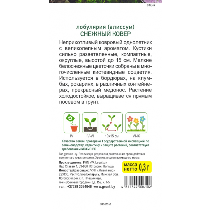 Кустики сильно разветвленные, компактные, округлые, высотой до 15 см. Мелкие белоснежные цветочки собраны в многочисленные кистевидные соцветия.