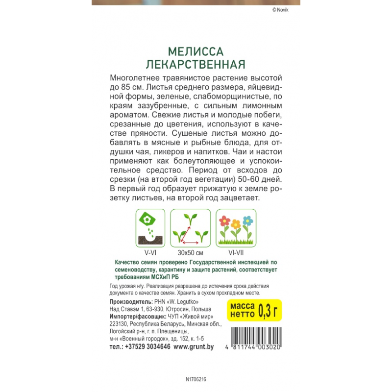 Период от всходов до срезки (на второй год вегетации) 50-60 дней. В первый год образует прижатую к земле розетку листьев, на второй год зацветает. Листья среднего размера, яйцевидной формы, зеленые, слабоморщинистые, по краям зазубренные, с сильным лимонным ароматом.