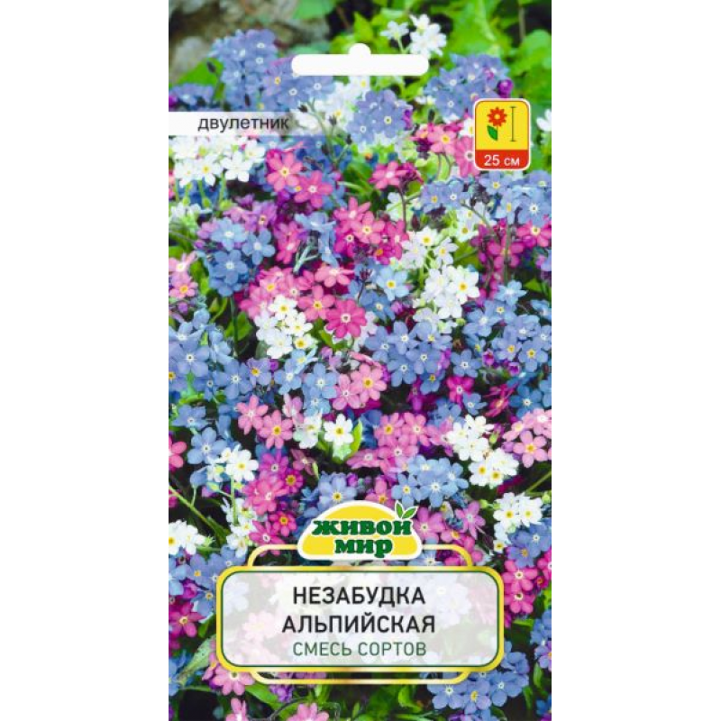 Высота 20-30 см Неприхотливый, зимостойкий двулетник. Кустик компактный, высотой 20-30 см. Мелкие розовые, белые, голубые цветочки собраны в рыхлые соцветия-завитки. Цветение очень обильное в мае-июне. Смесь хороша для оформления весенних цветников с тюльпанами и нарциссами, окантовки декоративных водоемов, хорошо растет в полутени под деревьями и кустарниками.