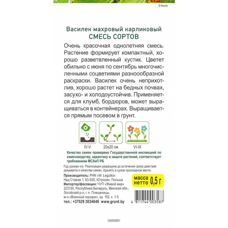 Высота около 30 см. Очень красочная однолетняя смесь. Растение формирует компактный, хорошо разветвленный кустик. Цветет обильно с июня по сентябрь многочисленными соцветиями разноообразной раскраски. Василек очень неприхотлив, хорошо растет на бедных почвах, засухо- и холодоустойчив. Применяется для клумб, бордюров, может выращиваться в контейнерах. Выращивается прямым посевом в грунт.